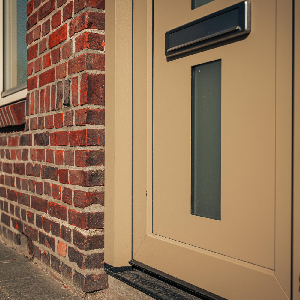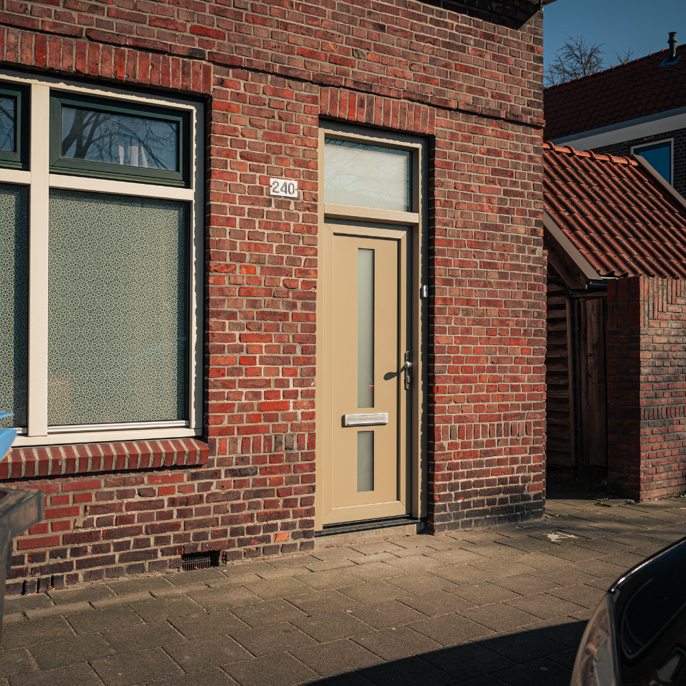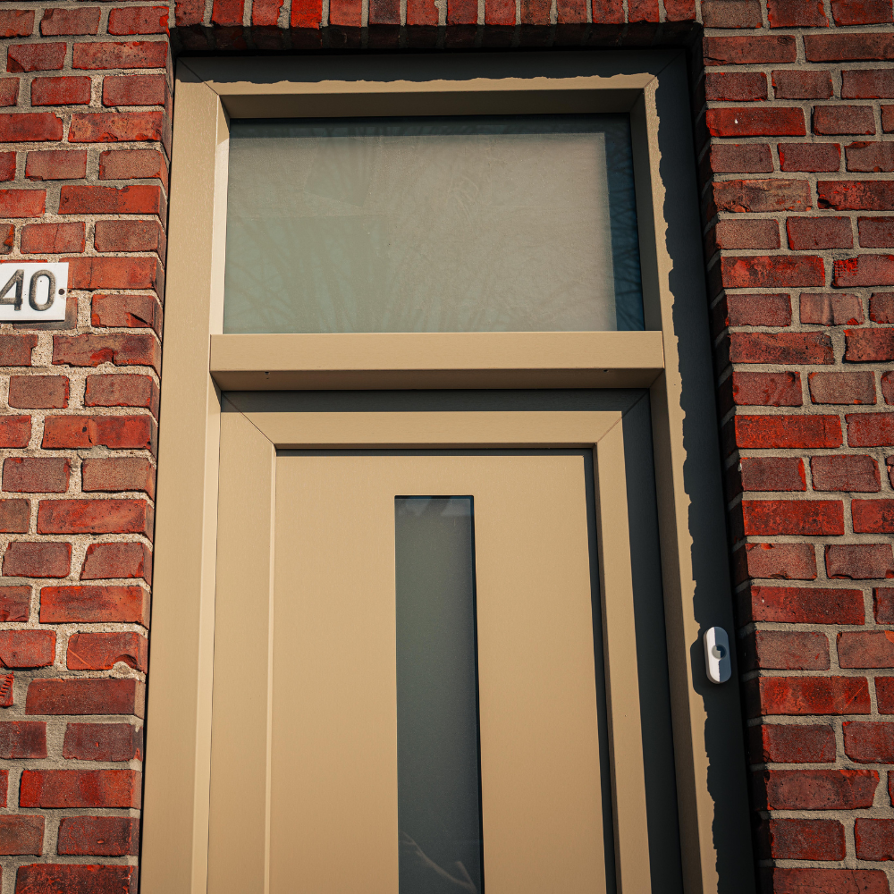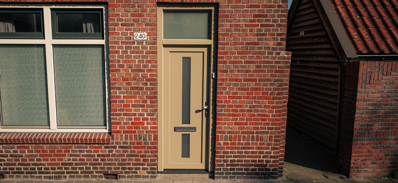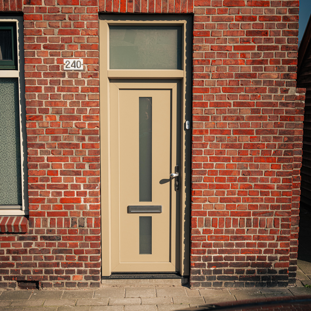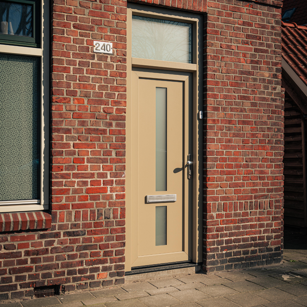 Wat deze voordeur bijzonder maakt, is de gekozen kleurstelling. Waar veel voordeuren tegenwoordig zwart, wit of antraciet zijn, is hier bewust gekozen voor een warme beige/taupe tint. Deze kleur geeft de woning een frisse en stijlvolle uitstraling en vormt een mooi contrast met het metselwerk van de gevel.
