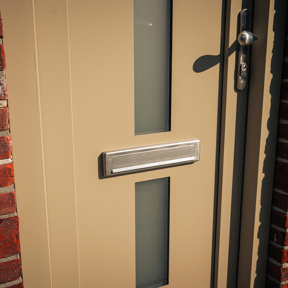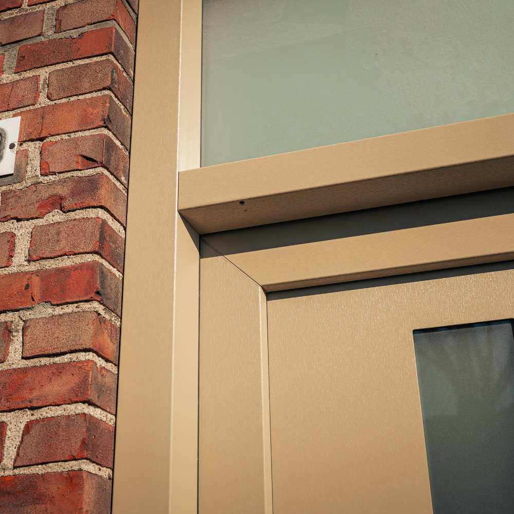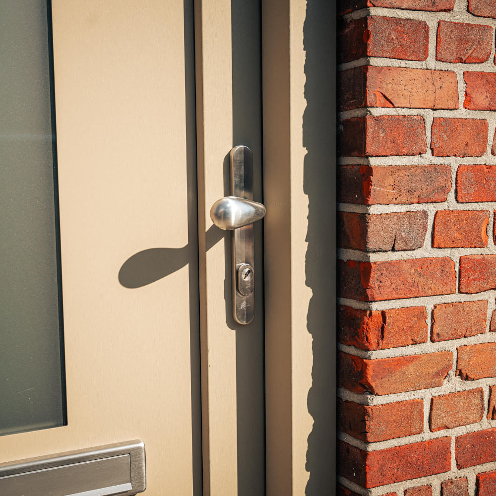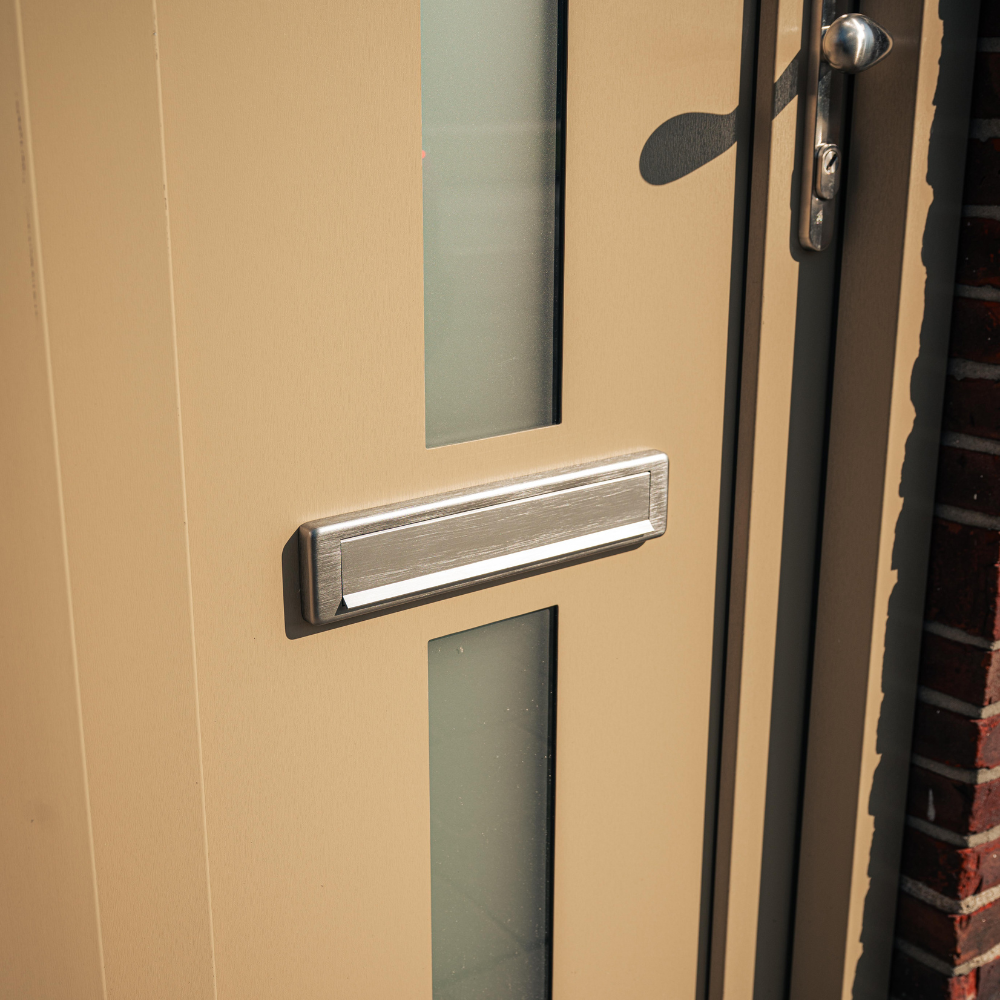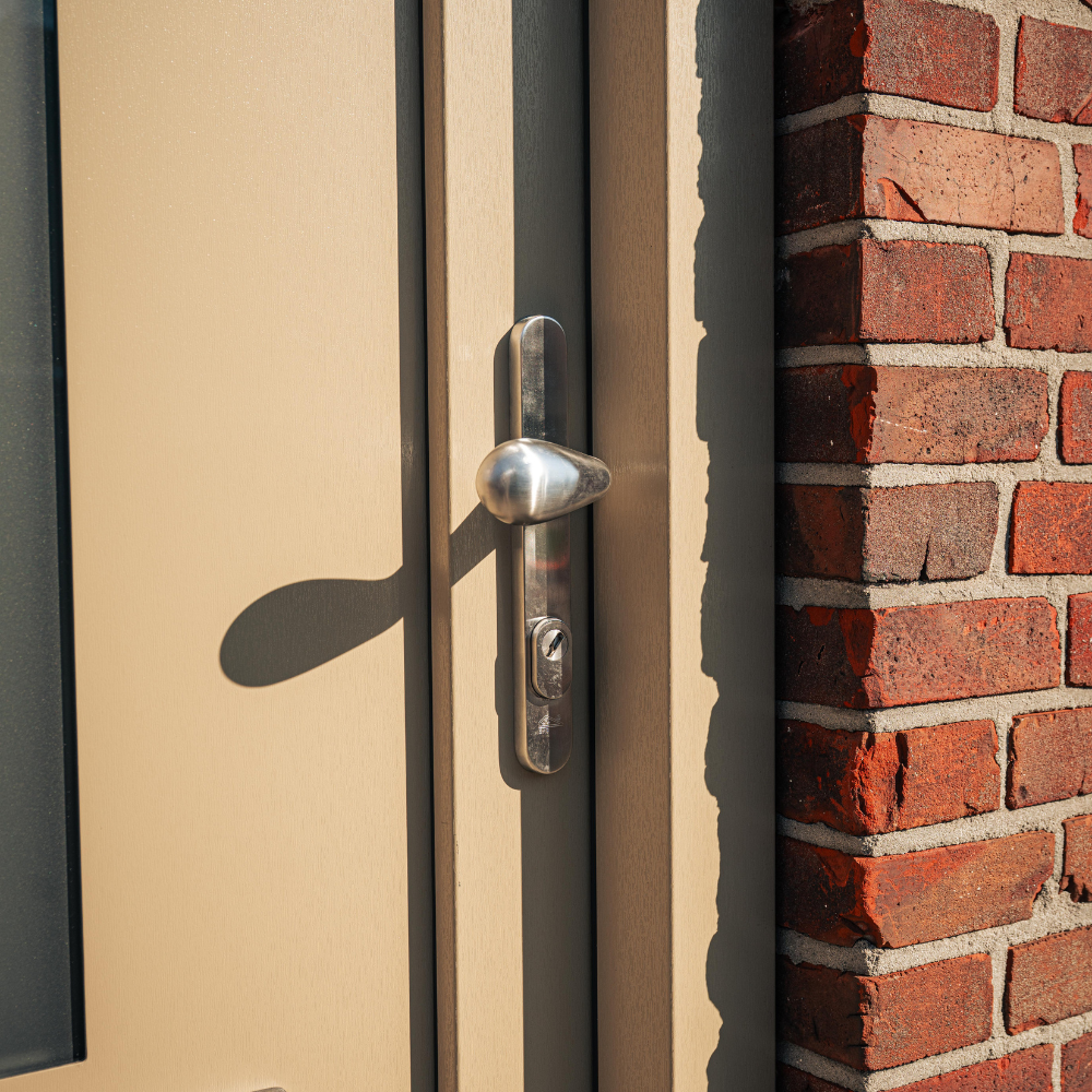 Wat deze voordeur bijzonder maakt, is de gekozen kleurstelling. Waar veel voordeuren tegenwoordig zwart, wit of antraciet zijn, is hier bewust gekozen voor een warme beige/taupe tint. Deze kleur geeft de woning een frisse en stijlvolle uitstraling en vormt een mooi contrast met het metselwerk van de gevel.